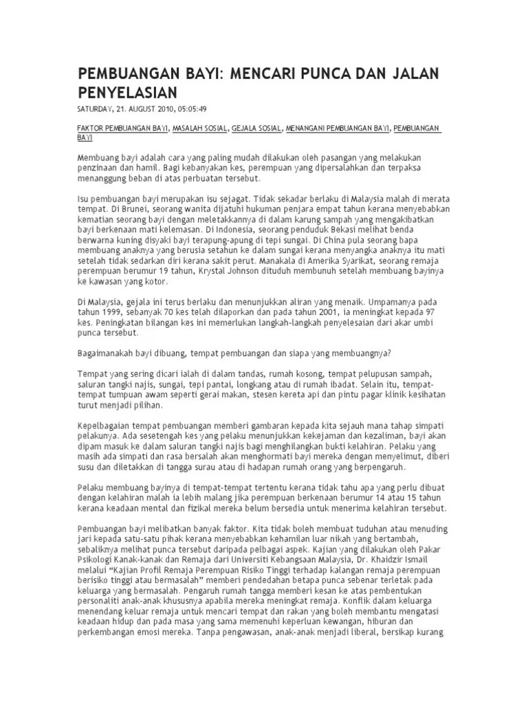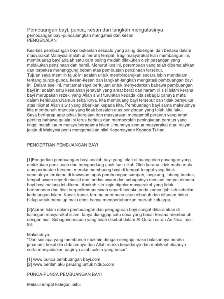 Pembuangan Bayi from cdn.slidesharecdn.com Satu daripada punca penyebab masalah ini adalah pengaruh rakan sebaya. Punca pembuangan bayi juga adalah disebabkan pengaruh rakan sebaya. Marcapada ini, negara kita telah berkembang pesat sama ada dari segi ekonomi, sosial ataupun politik dalam menongkah arus modenisasi dan globalisasi. Kes pembuangan bayi ini ada kaitannya daripada ibu bapa kerana konflik dalam. Oleh sebab itu, rakyat malaysia perlu tahu tentang kewujudan baby hatch yang telah disediakan di negara ini bagi menangani jenayah tersebut. Sayangilah mereka kerana mereka tidak berdosa. Yang telah dibuang oleh pasangan yang. Pembuangan bayi punca punca dan langkah mengatasi.