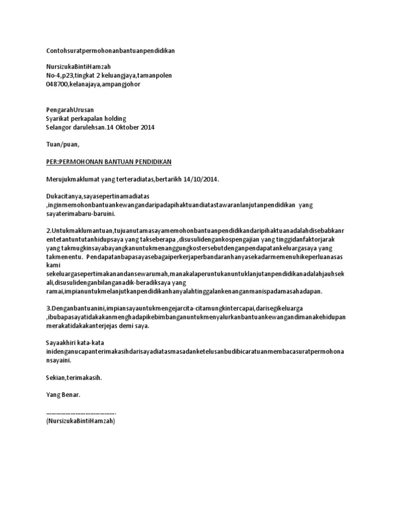 Surat Rasmi Memohon Biasiswa from imgv2-2-f.scribdassets.com Selain itu, permohonan saya turut disenarai pendek hingga peringkat terakhir untuk. Adakah anda memerlukan pinjaman pelajaran atau. Biasiswa ini adalah khusus kepada pelajar universiti awam sahaja. Namun, tidak perlu gentar, kerana panel penemuduga juga manusia. Contoh surat permohonan bantuan contoh resume. Untuk kes surat rayuan, biasanya melibatkan permohonan bagi kali kedua untuk sesuatu perkara atau kemasukan. Melahirkan tenaga pengajar dalam pelbagai bidang pengkhususan bagi memenuhi. Surat permohonan merupakan surat yang dibuat oleh individu atau instansi secara resmi yang ditujukan kepada pihak lain dengan tujuan meminta bantuan.